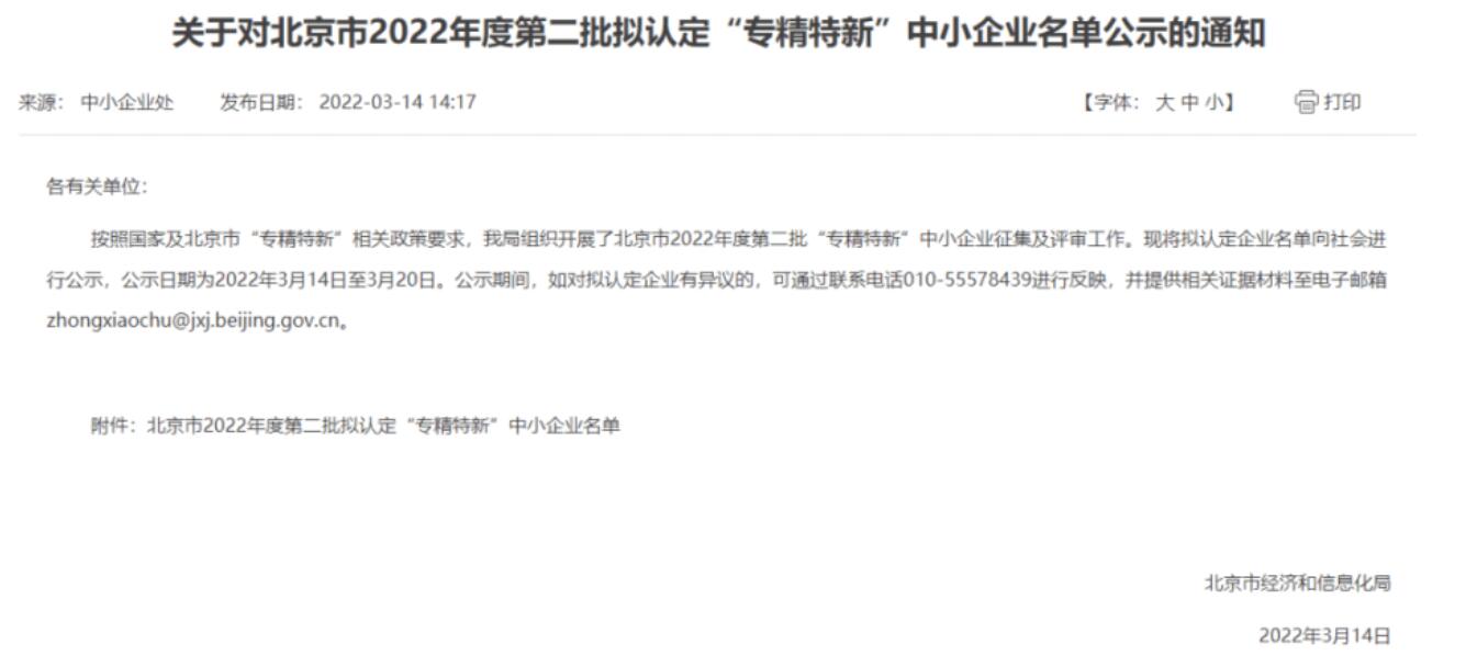 近日,北京市經濟和信息化局發布了2022年度第二批北京市“專精特新”中小企業名單,研信通科技憑借在信息化高端裝備科技領域的突出表現和創新能力,成功入選,被評為2022年度北京市“專精特新”企業!